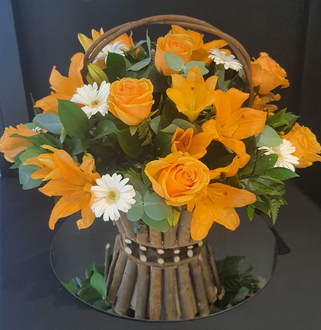 A delightful wooden basket holds enchanting orange roses, graceful lilies, and lush greenery. Let nature’s charm brighten your space with this captivating arrangement.