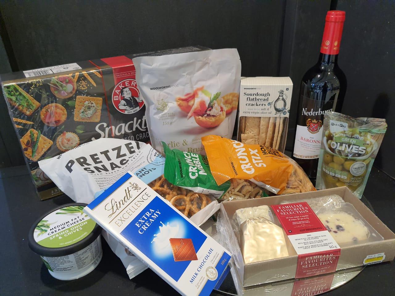 Cheese, wine and biscuit hamper with added yummy goodies.